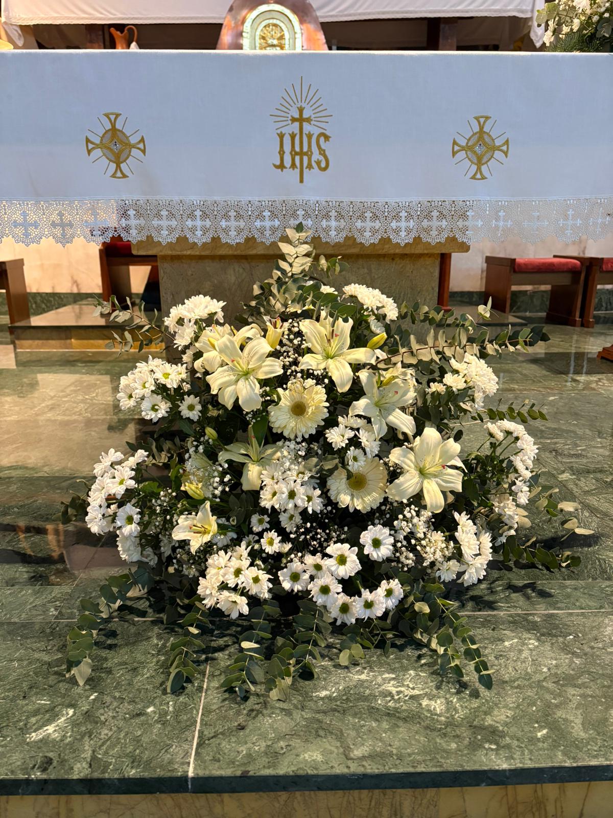Centro de iglesia con flores blancas variadas y eucalipto, ideal para celebraciones.